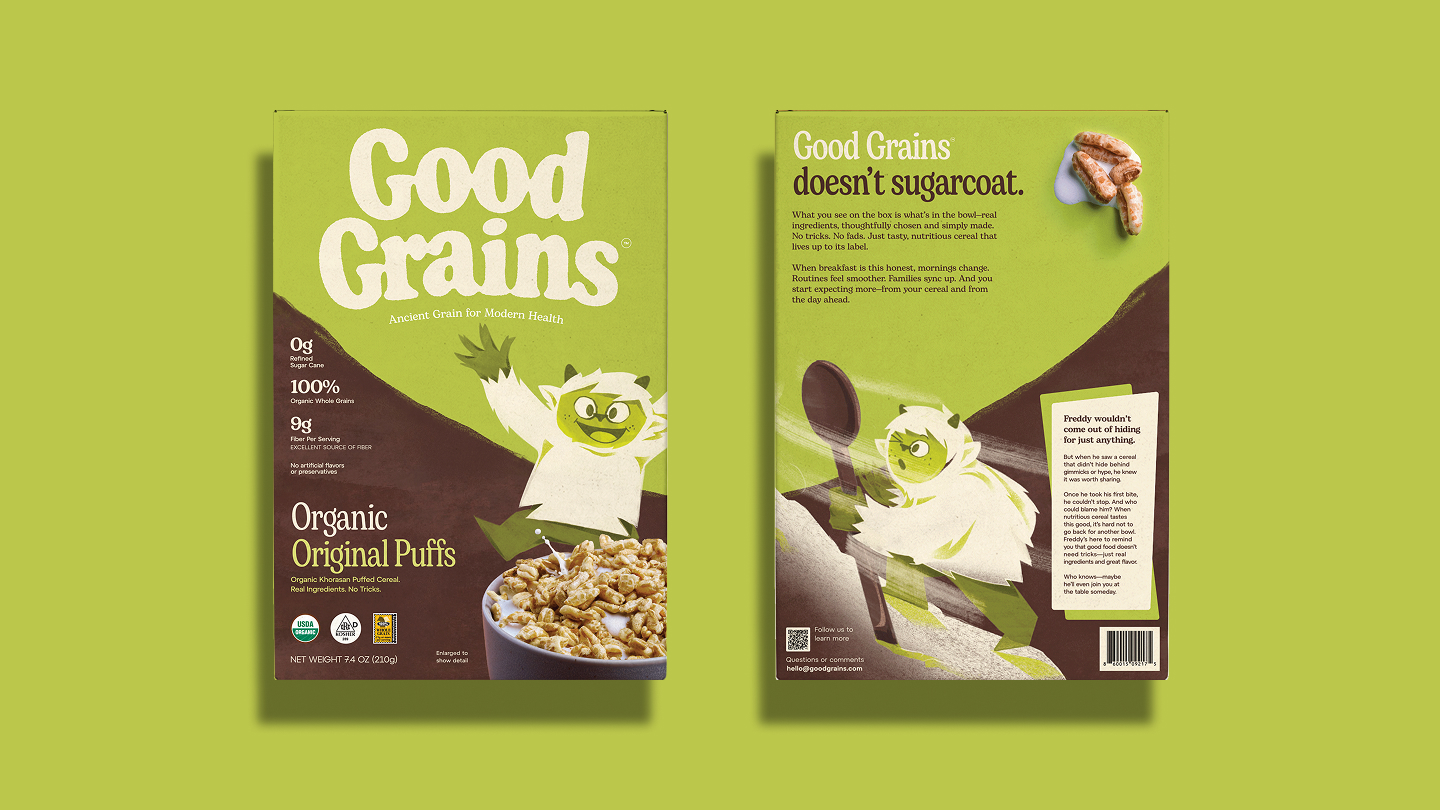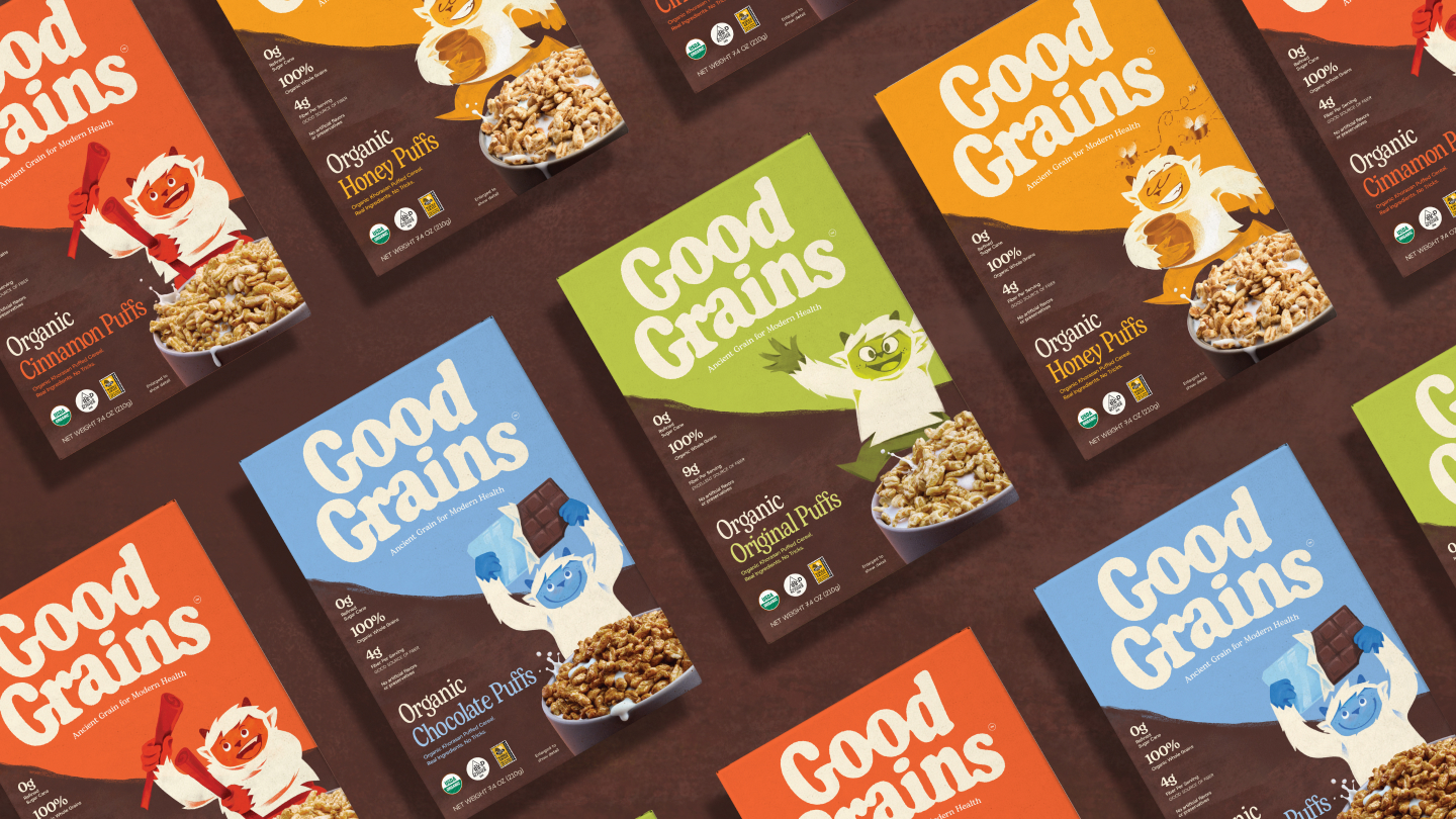 We built Good Grains around bold ingredient transparency. Instead of hiding behind claims, we made the ingredients the hero — spotlighting features like organic khorasan wheat as a true point of difference. The visual identity reinforces this honesty through a grounded, natural color palette and straightforward tone of voice. At the same time, we leaned into flavor as a celebration — chocolate, honey, and cinnamon appearing in their recognizable, organic forms on pack. The brand speaks with clarity and confidence: real ingredients, real food, real transparency. The yeti adds balance, introducing warmth, playfulness, and intrigue. Ensuring the brand resonates with both parents and children while staying true to its core promise.